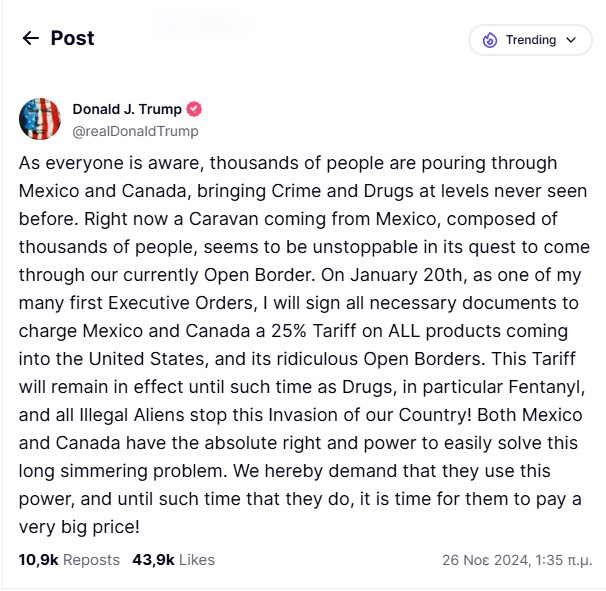 Στην πλατφόρμα Truth Social, ο Τραμπ δήλωσε ότι θα υπογράψει Εκτελεστικές Εντολές για την επιβολή δασμών 25% σε όλα τα προϊόντα που εισάγονται στις ΗΠΑ από το Μεξικό και τον Καναδά, ως μέτρο πίεσης για την πάταξη της παράνομης μετανάστευσης και της διακίνησης φαιντανύλης, η οποία θεωρείται υπεύθυνη για πολλές θύματα υπερβολικής δόσης στις ΗΠΑ. Αυτοί οι δασμοί θα παραμείνουν σε ισχύ μέχρι να λυθεί το πρόβλημα.