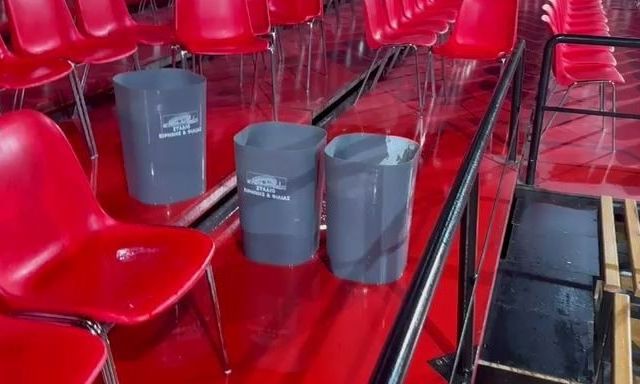 Οι σφοδρές καταιγίδες προκάλεσαν ζημιές στο παρκέ, το Cube και στον εξοπλισμό του γυμναστηρίου, σύμφωνα με πληροφορίες από την ΕΡΤ.