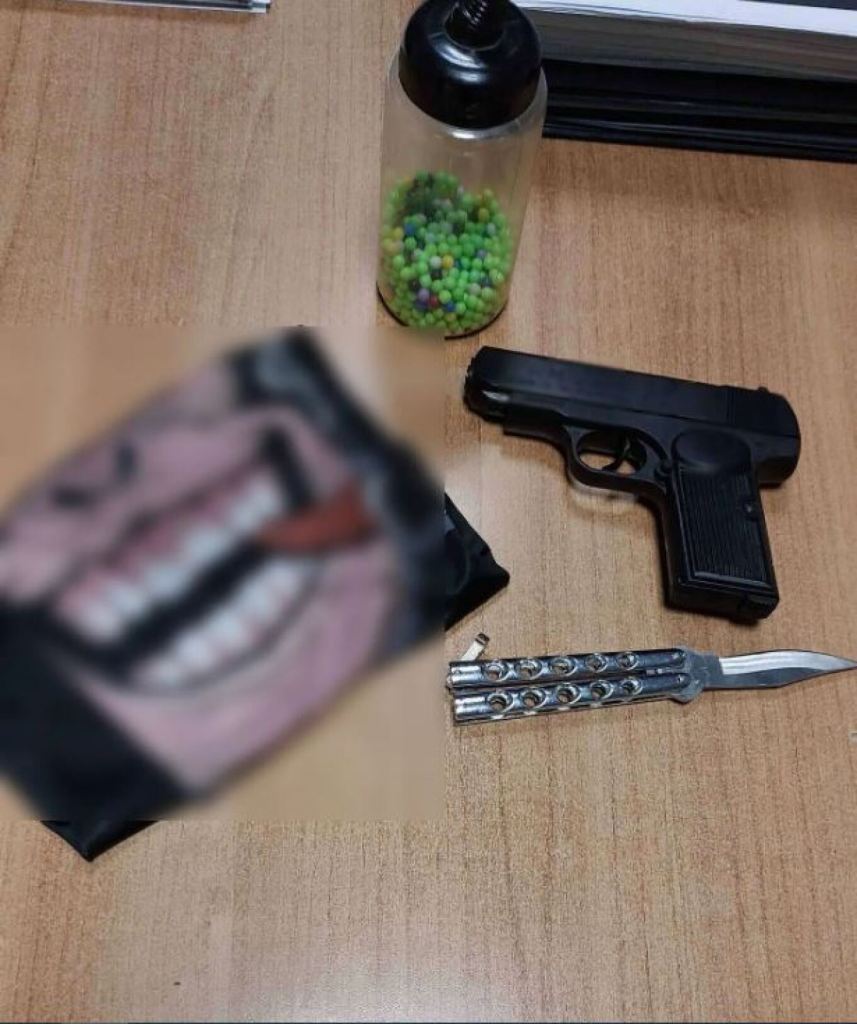 Κατά τη διάρκεια της έρευνας, οι αστυνομικοί κατέσχεσαν από τον 14χρονο ένα αεροβόλο πιστόλι, ένα μαχαίρι τύπου πεταλούδα, 440 μπίλιες αεροβόλου όπλου και μια κουκούλα τύπου full face.