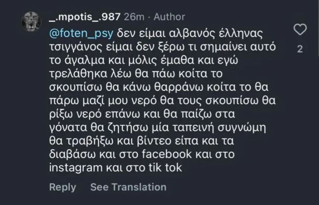 Μετά τον σάλο που προκλήθηκε, ο νεαρός απάντησε σε σχόλια χρηστών στα social media, ξεκαθαρίζοντας ότι δεν είναι Αλβανός, αλλά Έλληνας τσιγγάνος.