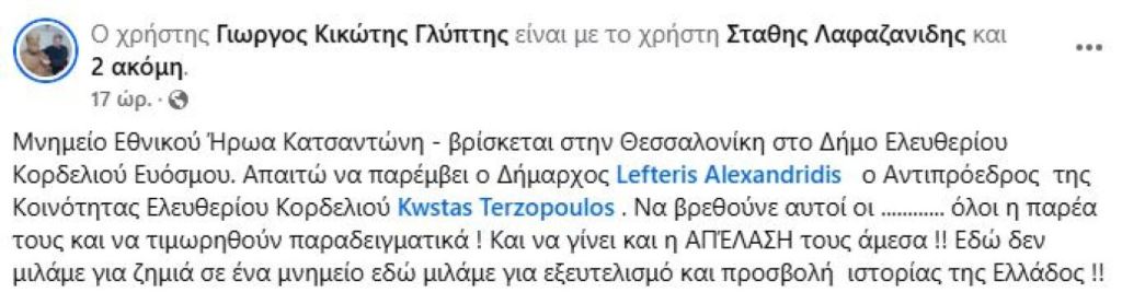 «Να βρεθούνε αυτοί οι ………… όλοι η παρέα τους και να τιμωρηθούν παραδειγματικά! Και να γίνει και η ΑΠΈΛΑΣΗ τους άμεσα!! Εδώ δεν μιλάμε για ζημιά σε ένα μνημείο, εδώ μιλάμε για εξευτελισμό και προσβολή της ιστορίας της Ελλάδος!!».