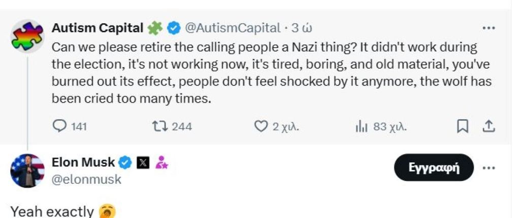Ο Μασκ συνέχισε, χαρακτηρίζοντας την επίθεση “όλοι είναι Χίτλερ” ως βαρετή και αναγγέλλοντας ότι οι επικριτές του χρειάζονται καλύτερα «βρώμικα κόλπα».