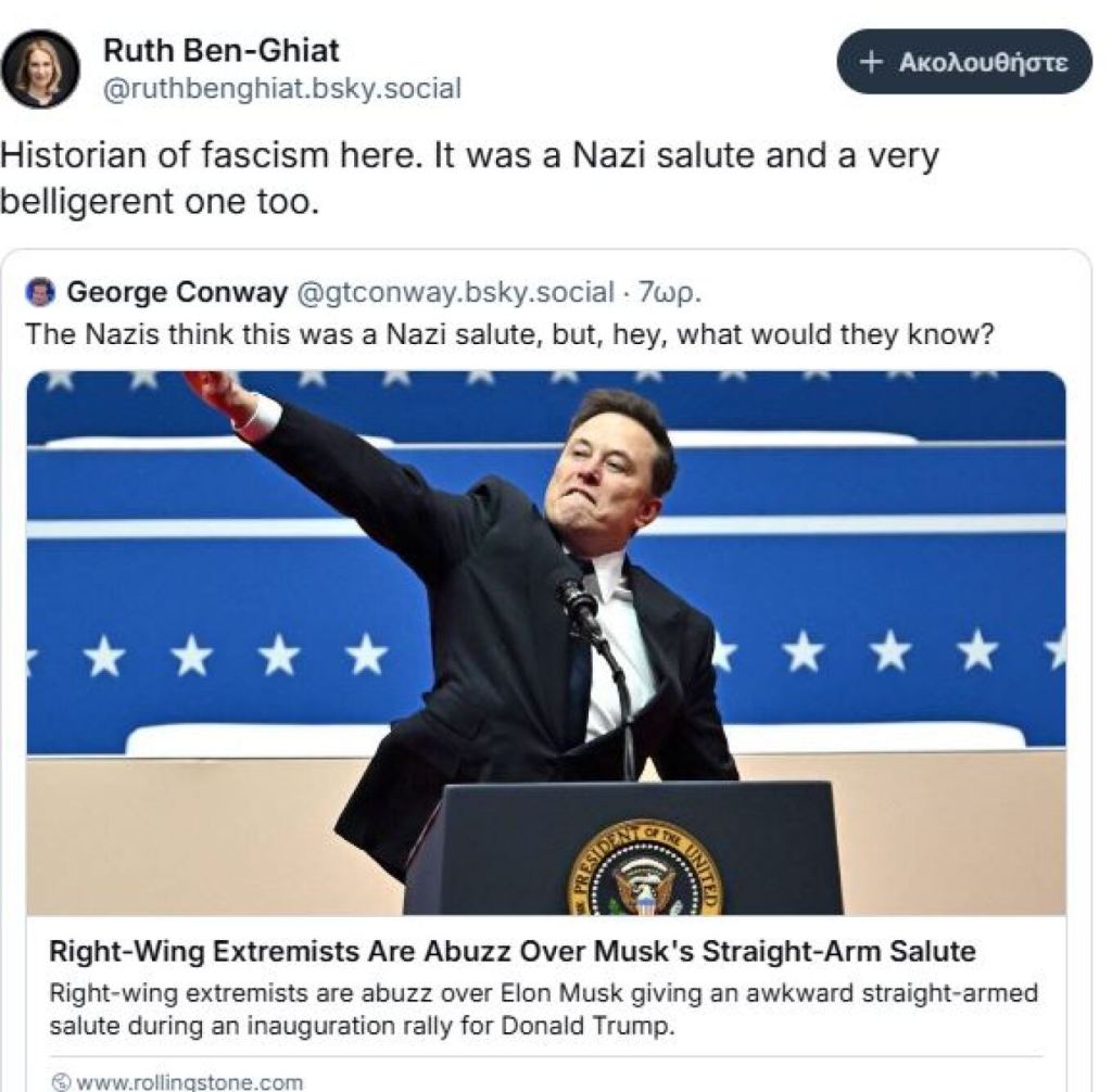 Η καθηγήτρια Ιστορίας Ρουθ Μπεν-Γκιάτ τόνισε ότι ο χαιρετισμός είχε επιθετική ναζιστική χροιά.