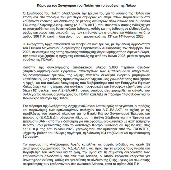 «Σε σχέση με το πόρισμα του Συνηγόρου του Πολίτη για το ναυάγιο της Πύλου, σημειώνονται τα εξής: