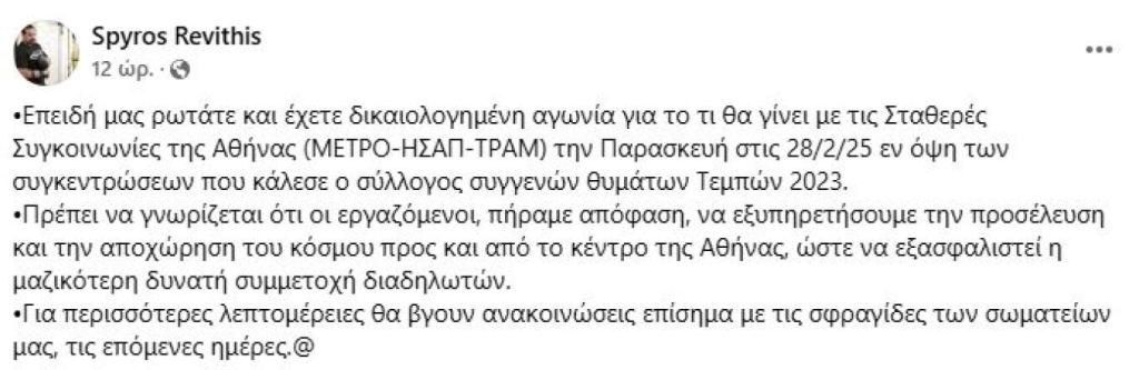 Ο Γενικός Γραμματέας του Σωματείου Εργαζομένων ΣΕΛΜΑ, Σπύρος Ρεβύθης, ανήρτησε απόφαση που αφορά τη συμβολή των εργαζομένων στους συγκοινωνιακούς φορείς Μετρό, ΗΣΑΠ και Τραμ, για την εξυπηρέτηση της προσέλευσης και αποχώρησης των διαδηλωτών της Παρασκευής, σε ένδειξη αλληλεγγύης για την τραγωδία στα Τέμπη.