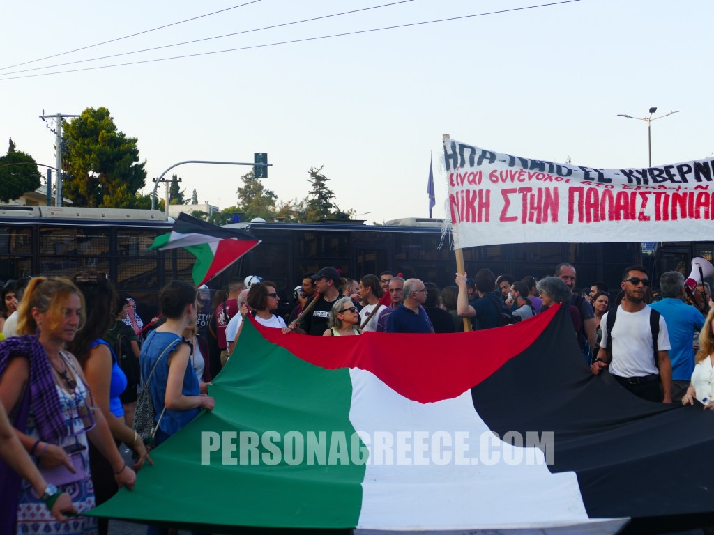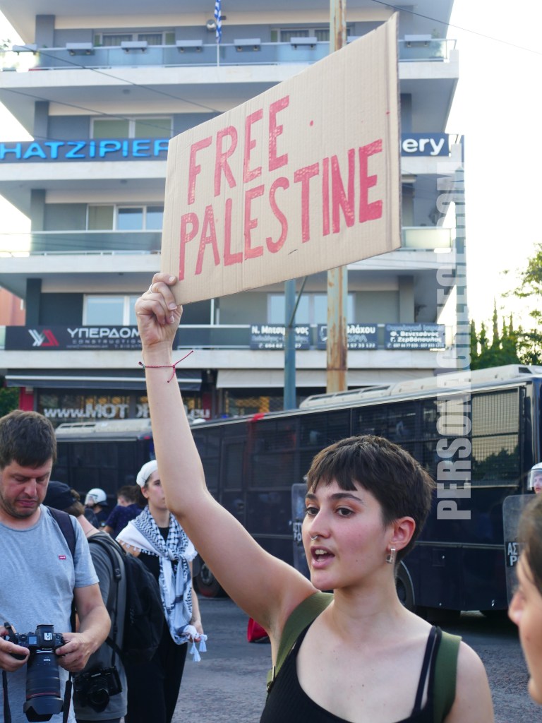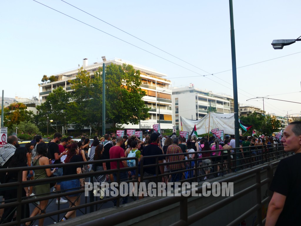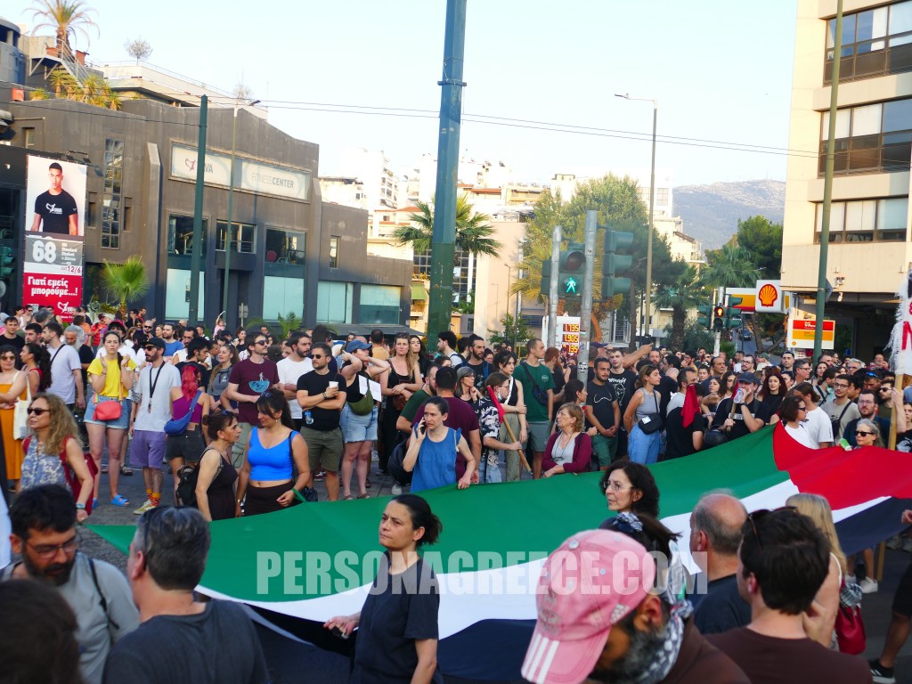 Περίπου 5.000 διαδηλωτές ξεκίνησαν από την Πανόρμου και κατευθύνθηκαν προς την πρεσβεία του Ισραήλ, διαμαρτυρόμενοι για την κατάληψη του πλοίου Madleen από τον ισραηλινό στρατό, ζητώντας την άμεση απελευθέρωση όσων επέβαιναν σε αυτό.